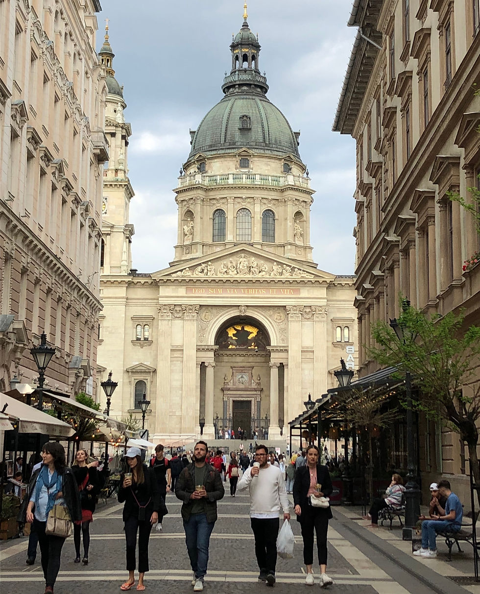 Zrínyi utca est une charmante petite rue passante qui mène à la Basilique Saint-Étienne de Pest 🏛. Elle est bordée par d'agréables restaurants et cafés à l'architecture colorée. Au bout de la rue, vous arriverez sur la grande place de la Basilique, un lieu rempli d'histoire. On peut s'y rendre pour profiter du calme, des rues pavées et des bâtiments au style néo-classique. C'est le lieu idéal pour sortir en famille ou entre amoureux et profiter d'un café en terrasse. Si vous poursuivez votre chemin, vous arriverez sur la rue la plus célèbre de la capitale, l'avenue Andrássy, située derrière la basilique. Elle est classée au patrimoine mondial de l'UNESCO et est reconnue pour ses nombreuses boutiques de luxe.